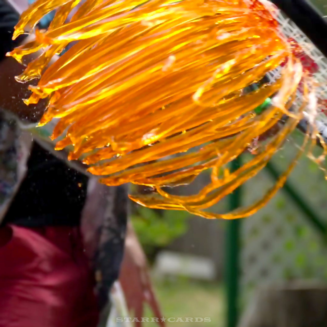 Aside from making a sticky mess, the experiment revealed that Jell-O struck with a tennis racket takes on the appearance of undulating iridescent dreadlocks.