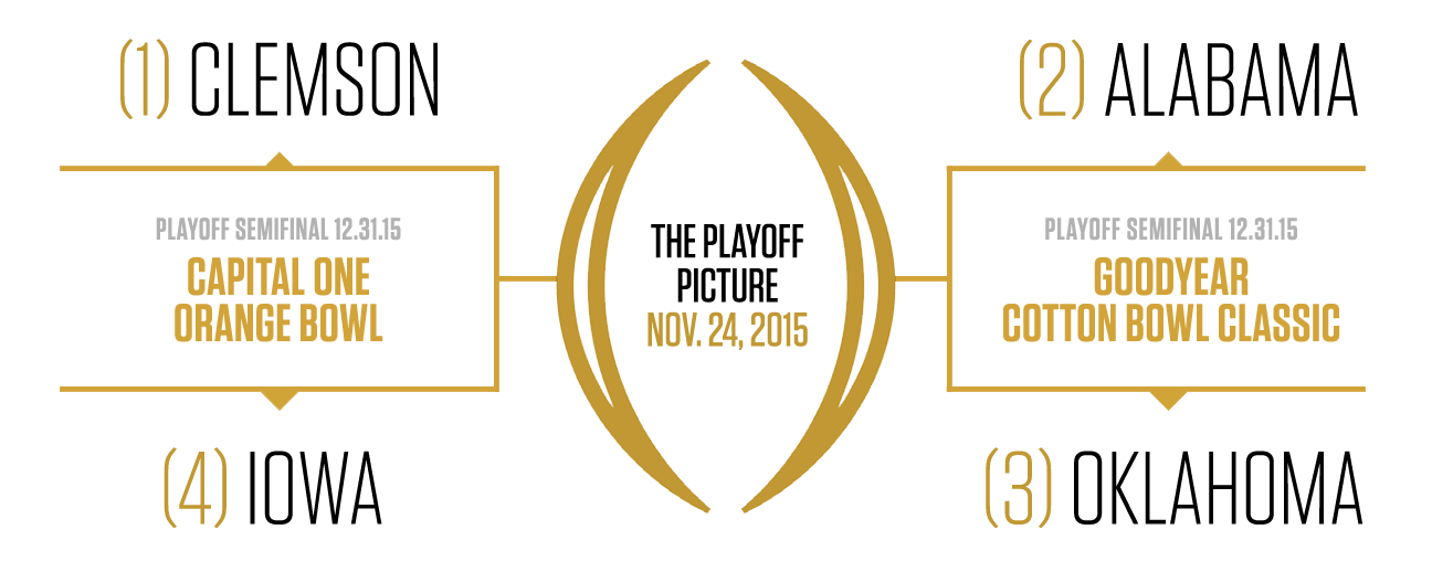 The new College Football Playoff rankings were released Tuesday night with a major reshuffling of the top ten save for the top two, Clemson and Alabama. The Oklahoma Sooners and Iowa Hawkeyes were newcomers to the top four, after Ohio State lost to Michigan State and Notre Dame struggled versus Boston College.