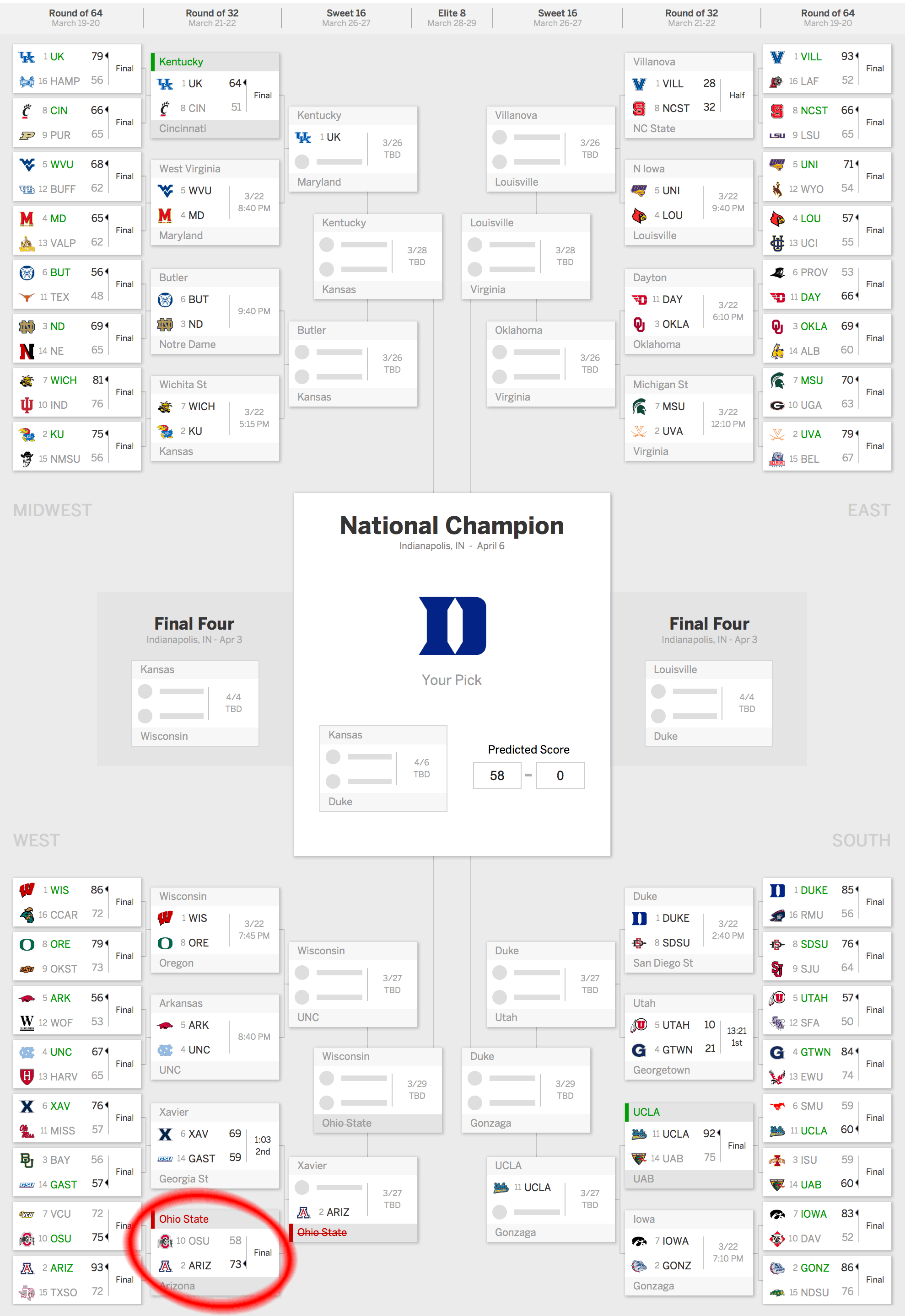 Malaquias4394 had maintained a perfect bracket at the ESPN-sponsored NCAA tournament challenge through the first thirty-four games played. But along came the Arizona Wildcats who ousted the Buckeyes 73-58 (after trailing most of the first half) and simultaneously ended the ultimate dream of bracket gurus everywhere.