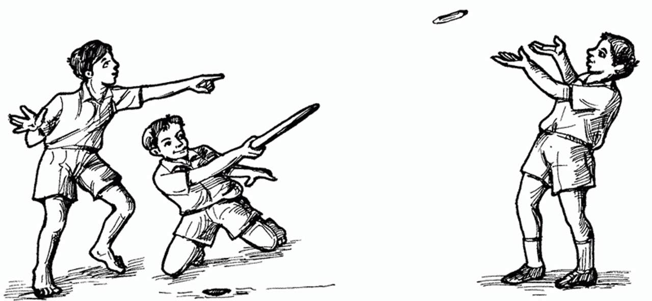 Known as as gilli-danda in its mother country, the game can still be found in many rural areas — in part due to its easily fashioned (or found) implements: the gilli, a 3-to-4 inch stick tapered at the ends, and the danda, a two-foot long stick which serves as a bat.