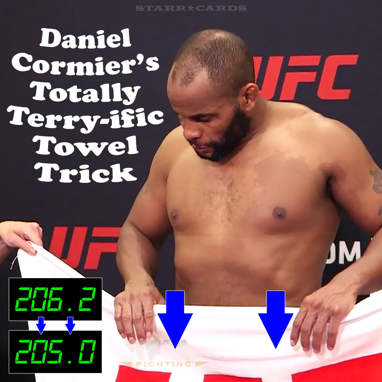 To the bewilderment of Ariel Helwani — who’s astonished commentary is heard in the video — the reigning champ weighed in at exactly 205 pounds. But if one examines the tape closely, it becomes painfully obvious that Cormier, under the pretense of peering at the scale, is pressing firmly down on the large towel in front of him to “lose” the 1.2 pounds in realtime.