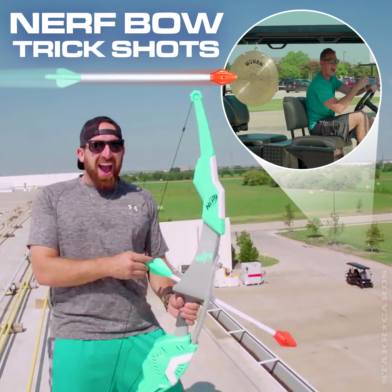 The final trick in the video had Tyler Toney firing an arrow from atop the Dude Perfect’s Frisco, Texas headquarters to hit a moving target — which in this case happened to be a gong suspended in a motorized cart driven by Cody Jones.