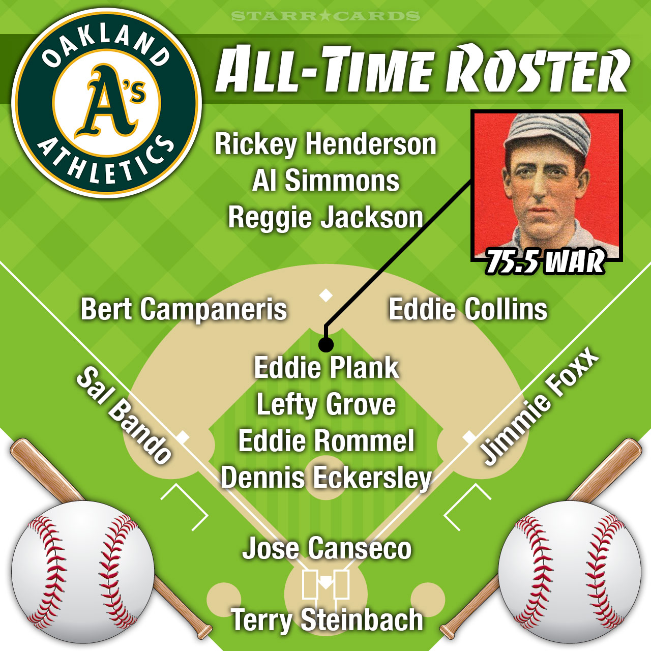 Following Plank and Henderson, the other players to have made the biggest contributions to the all-time roster by WAR, are pitcher Left Grove (63.7), first baseman Jimmie Foxx (62.5), and second baseman Collins (57.3).