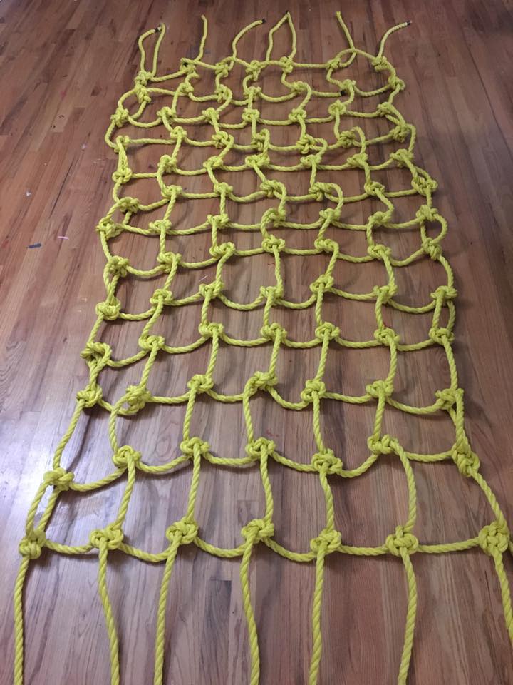 The four-by-eight foot cargo net was fashioned from 280 feet of 3/4 inch poly rope. Gavin anticipated it would take a while to tie all the knots, and it did — eight hours!