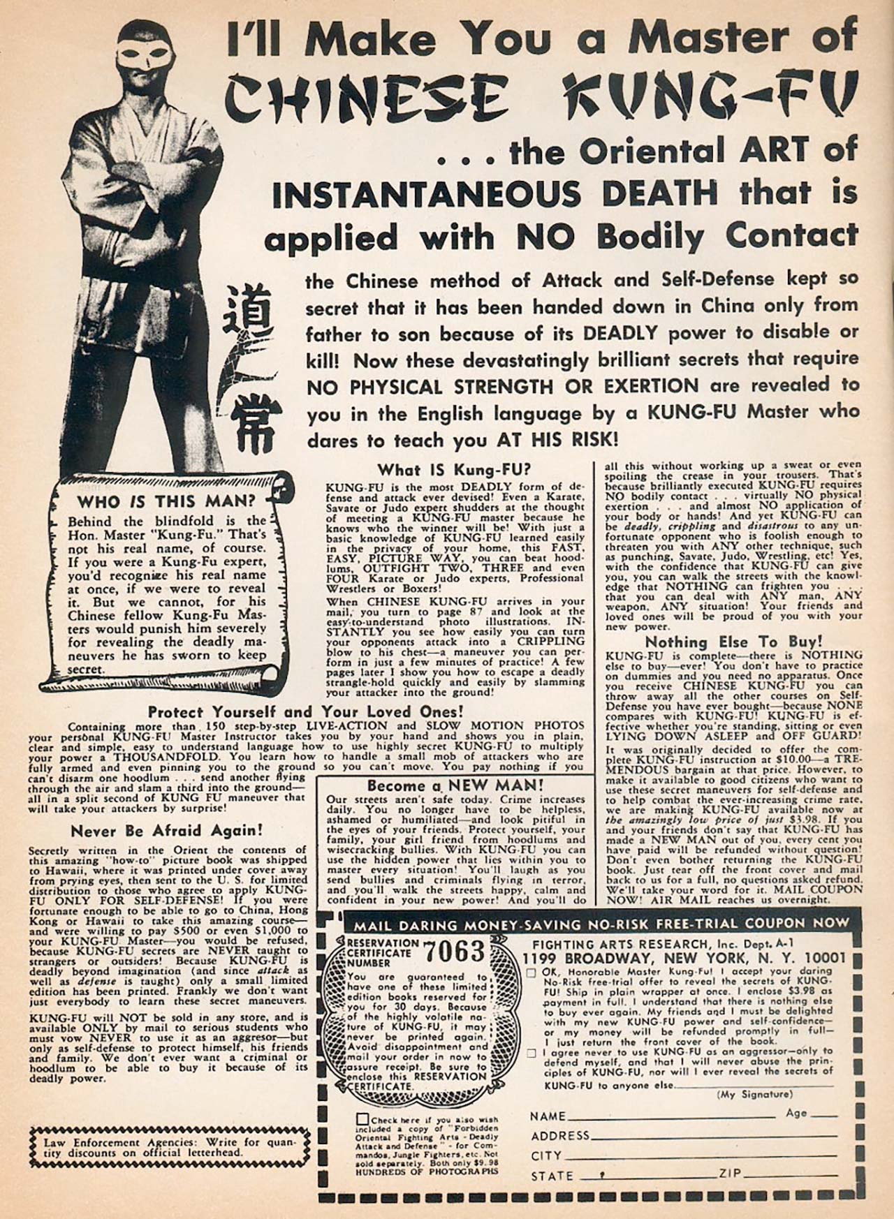 Of all the increasingly braggadocious and menacing ads, none could match the outrageousness of Count Dante’s “Dim Mak Death Touch”, which appeared regularly in comic books of the 1970s. Dante, born John Keehan, was a martial artist from Chicago who wildly reimagined his personal history to claim Spanish nobility and weave a tale of having participated in secret death matches in China and Thailand.