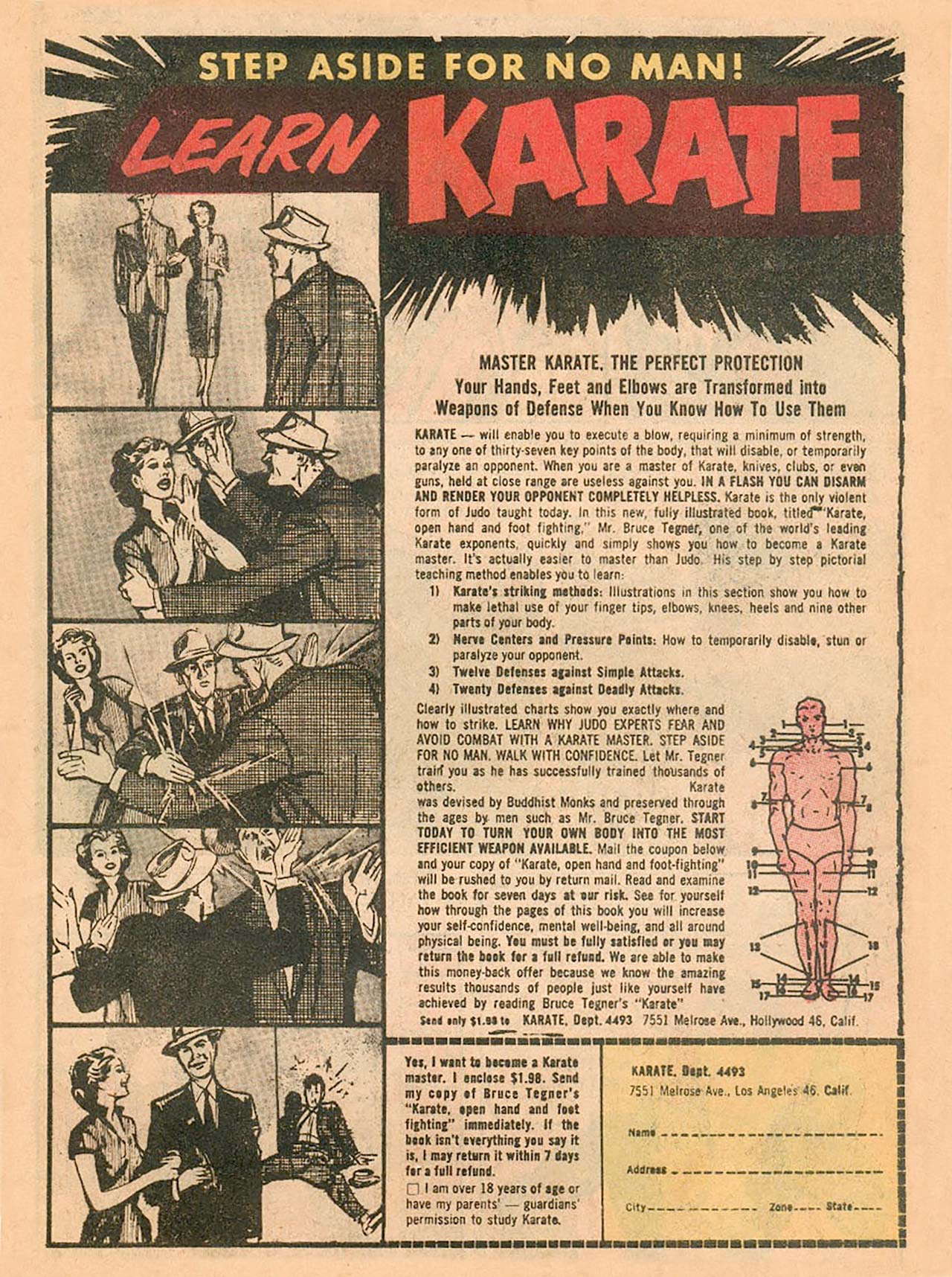 ''Karate is the secret, Oriental art of self-defense that turns your hands, arms or legs into paralyzing weapons... without any bodily contact.''