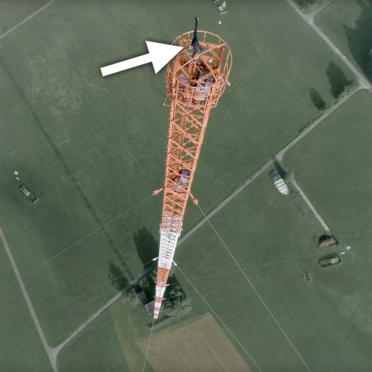 In 2015, the German based rooftopping crew known as Grave Yard Kidz pioneered the harness-free climb up Donebach Sender, posing triumphantly at the top to take selfies. As with BNT’s video, their laborious climb is marked by passage through the alternating white and orange-painted sections of the tower.