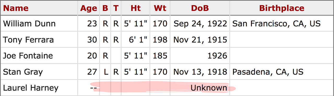 In 1947, Laurel F. Harney was one of two managers for the Victoria Athletics, a British-Columbia based affiliate of the New York Yankees, which played in the Western International League. The season before, he was listed on the team’s roster but failed to produce any statistics or even biographical data.