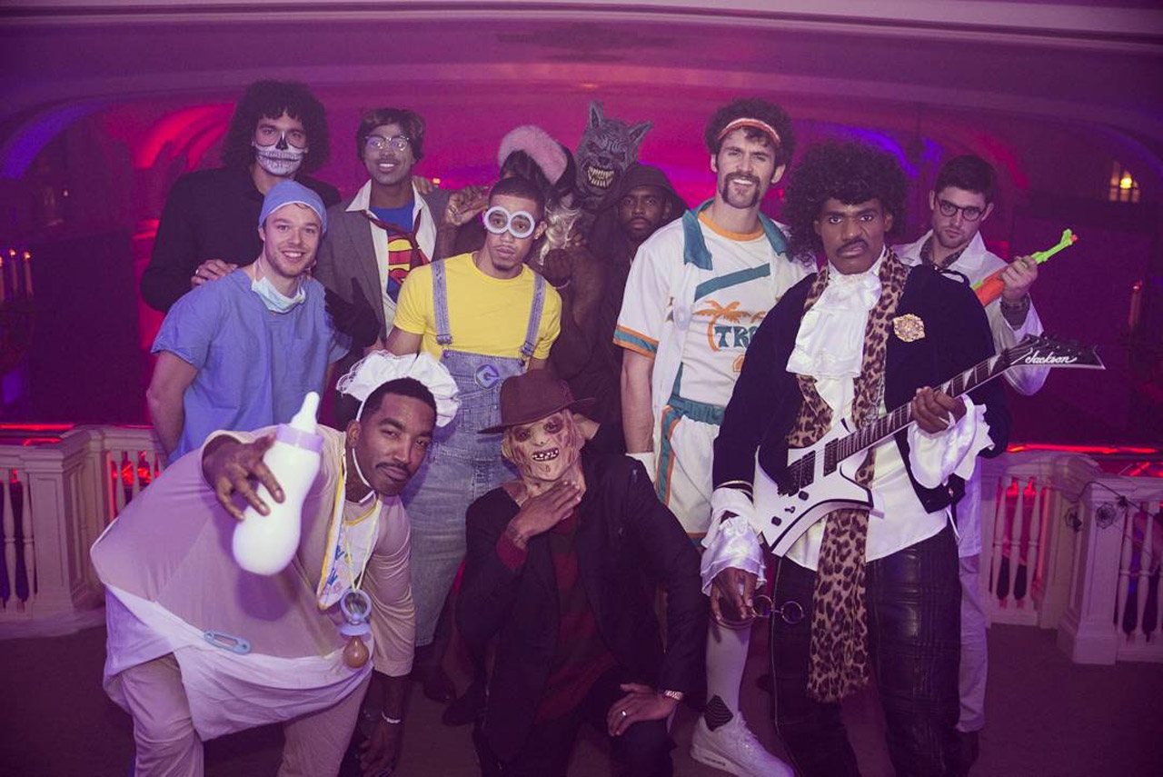 Backup dancers included Kyrie Irving (dressed as a Jedi knight), Jared Cunningham (as a minion), and Kevin Love (as Jackie Moon from Semi Pro).