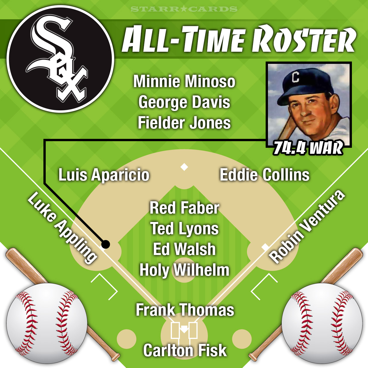 In his 20 seasons with the White Sox, Appling amassed 74.4 wins above replacement — the highest total on the franchise’s all-time roster by WAR. We slotted him in at third base to make room for Aparicio at short. The team’s other biggest WAR contributions came from pitcher Red Faber (68.5) and designated hitter Frank Thomas (68.3).