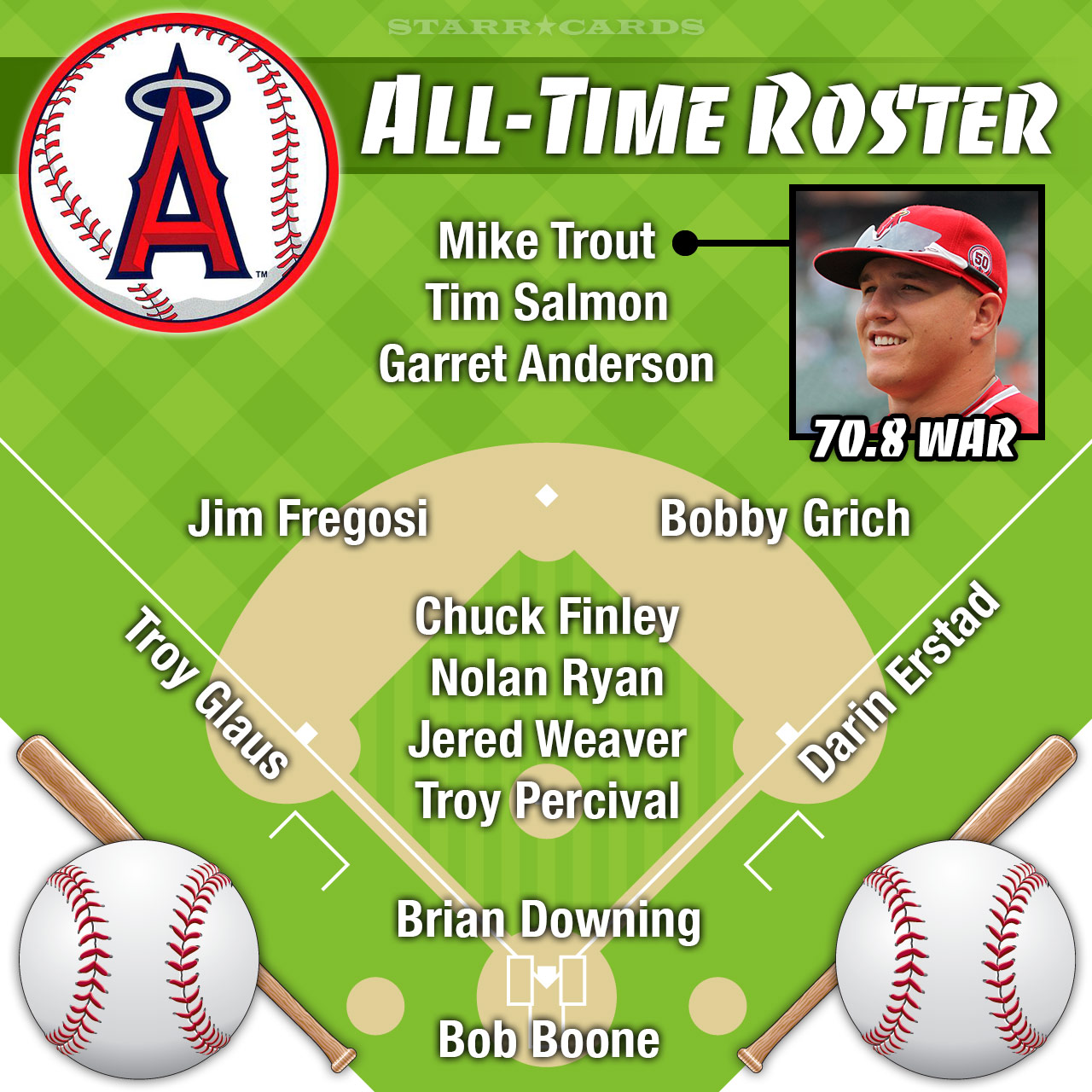 Trout leads the Angel’s all-time roster by wins above replacement at 83.2 (and counting). The team’s other biggest WAR contributions came from pitcher Chuck Finley (52.2) and shortstop Jose Cruz (45.9).