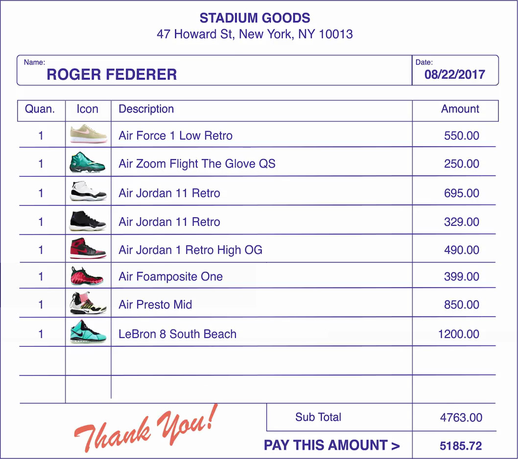 After taxes, Federer’s bill for eight pairs of shoes came to $5185.72, which to a man with career prize money of nearly 110 million is truly chump change.