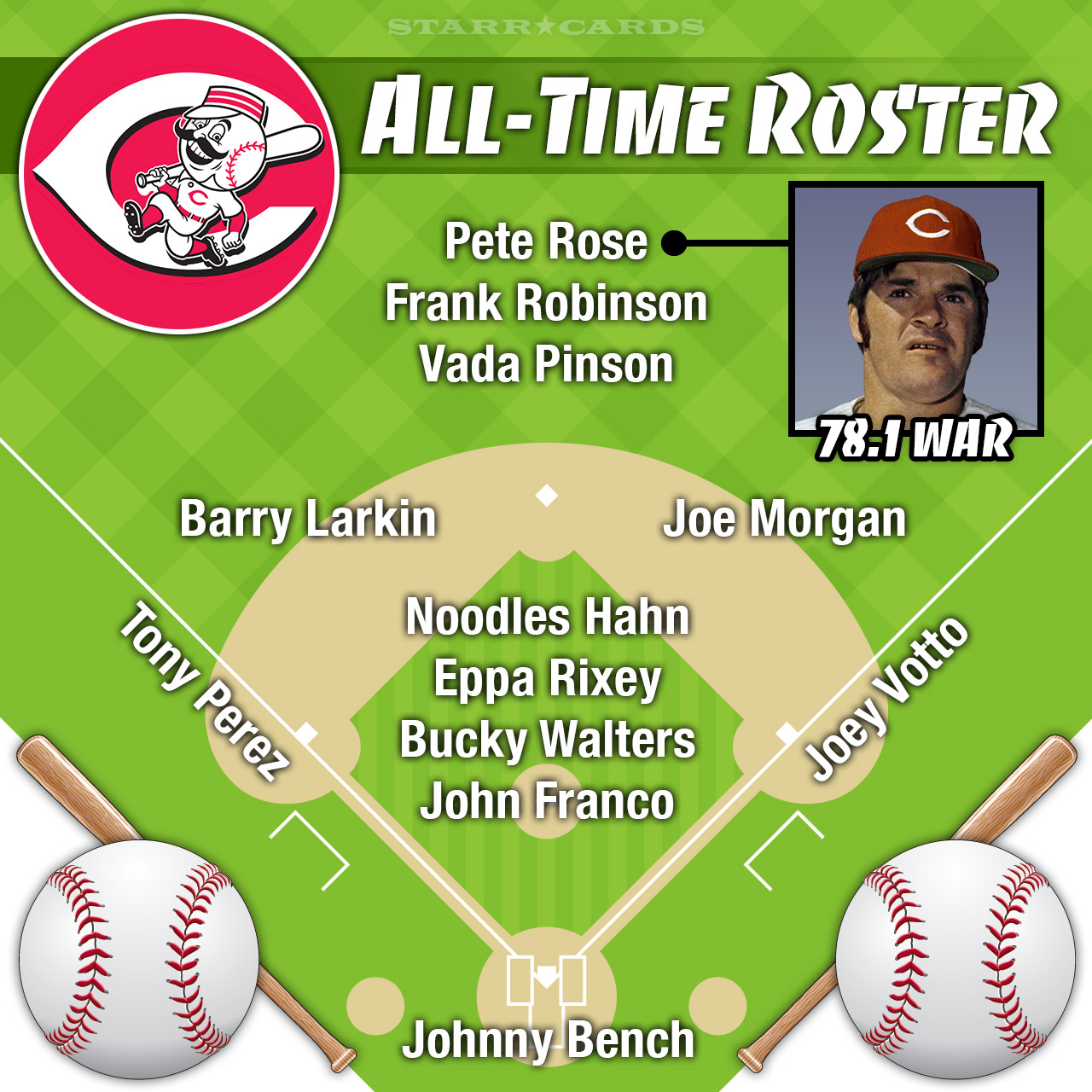 Here we present the entire Reds lineup constructed entirely by choosing the player with the team’s highest WAR at each position, including a rotation of three starting pitchers and one reliever.