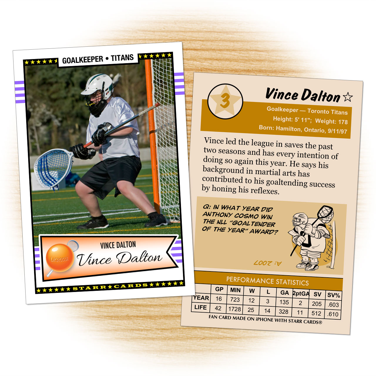 By default, the backsides of cards feature entertaining lacrosse trivia including a cartoon Q&A section, fast facts, insider capsules, and the best quotes from the history of the sport.