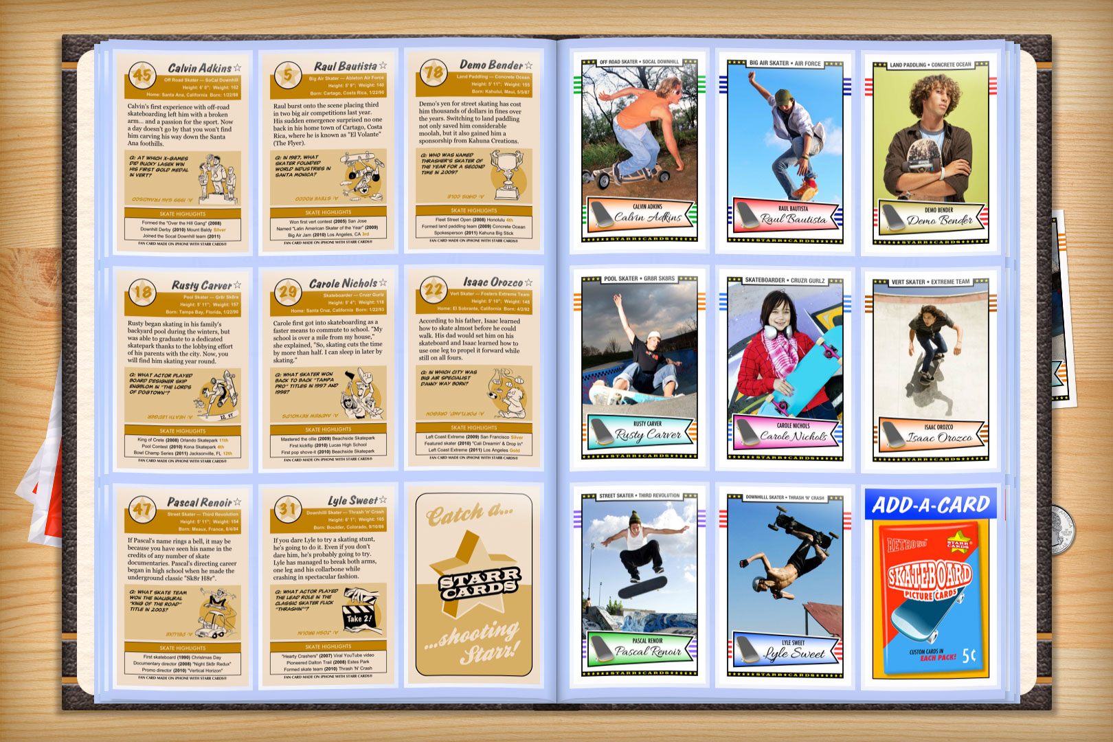 By default, the backsides of cards feature entertaining skater trivia including a cartoon Q&A section, fast facts, insider capsules, and the best quotes from the history of the sport.