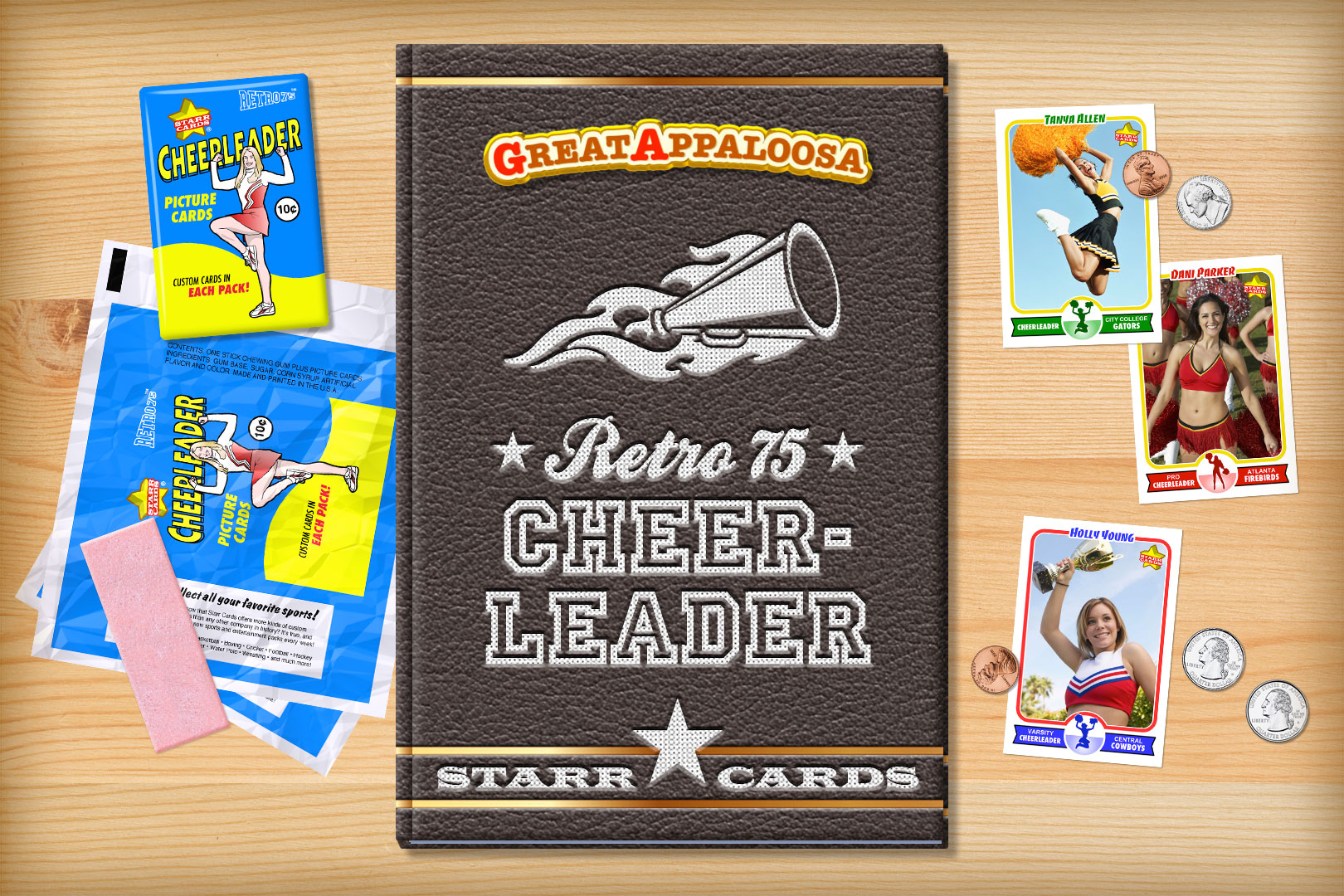 Starr Cards Retro 75 series captures the funky flavor of 70′s era trading cards with a detailed cheerleader silhouette, bold coloring and a raw-cardboard backside.