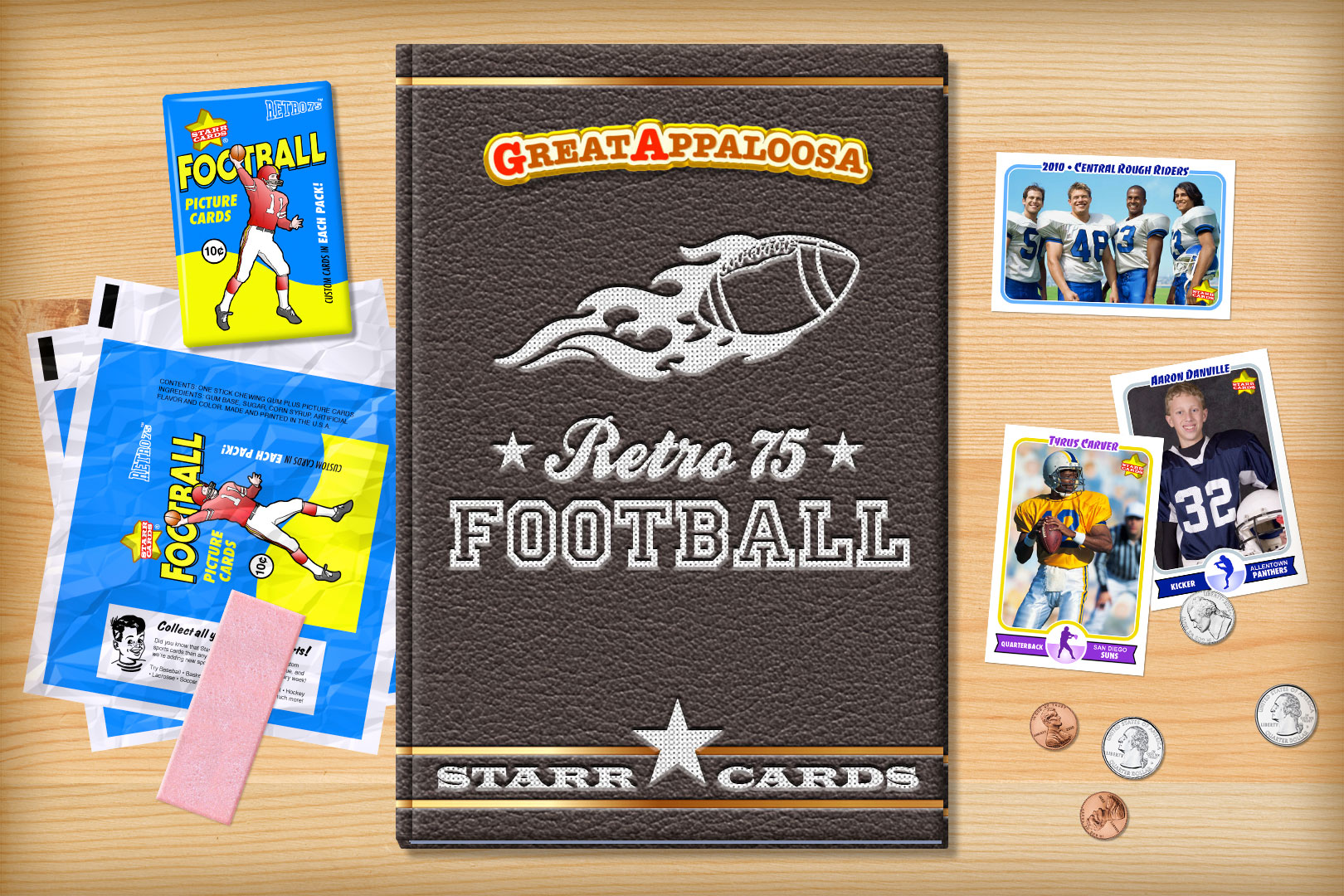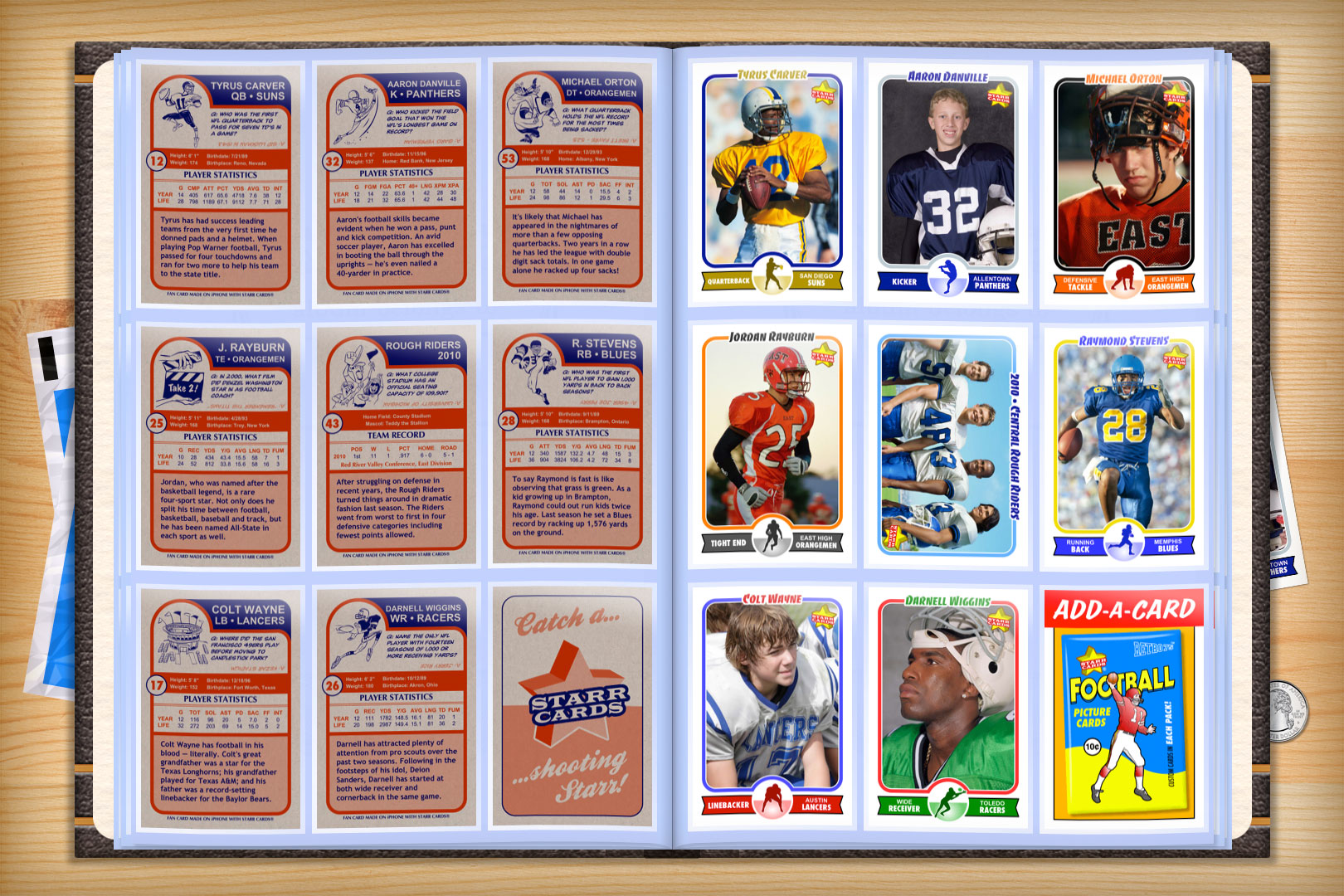 Retro 75 series is the primary custom football card design within Starr Cards award-winning Football Card Maker for the iPhone, iPad, or iPod. Its throwback look is the perfect fit for a Pop Warner, prep or college team — each and every card is sure to become a collectable keepsake.