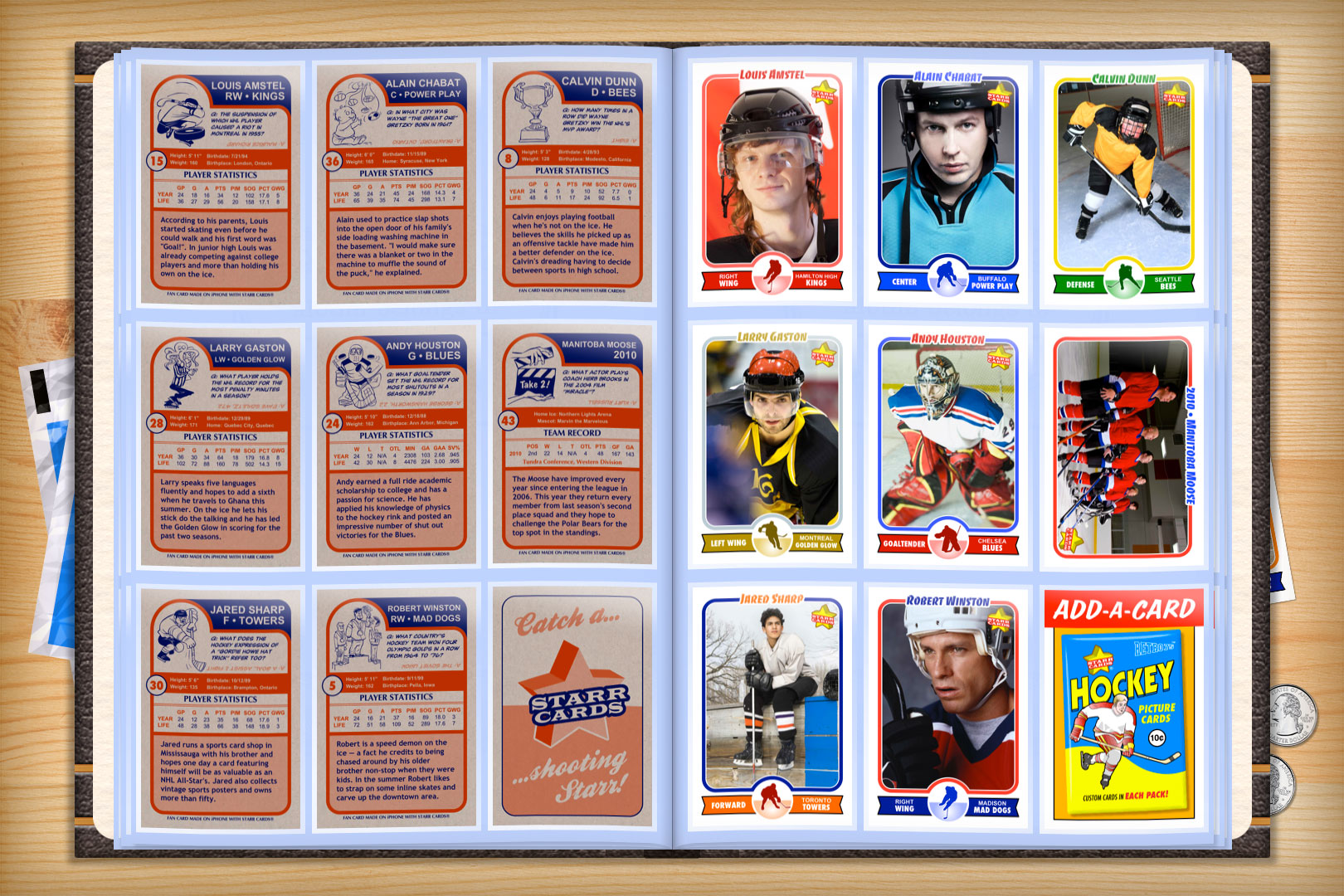 Retro 75 series is the primary custom hockey card design within Starr Cards award-winning Hockey Card Maker for the iPhone, iPad, or iPod. Its throwback look is the perfect fit for an amateur hockey league or prep team — each and every card is sure to become a collectable keepsake.