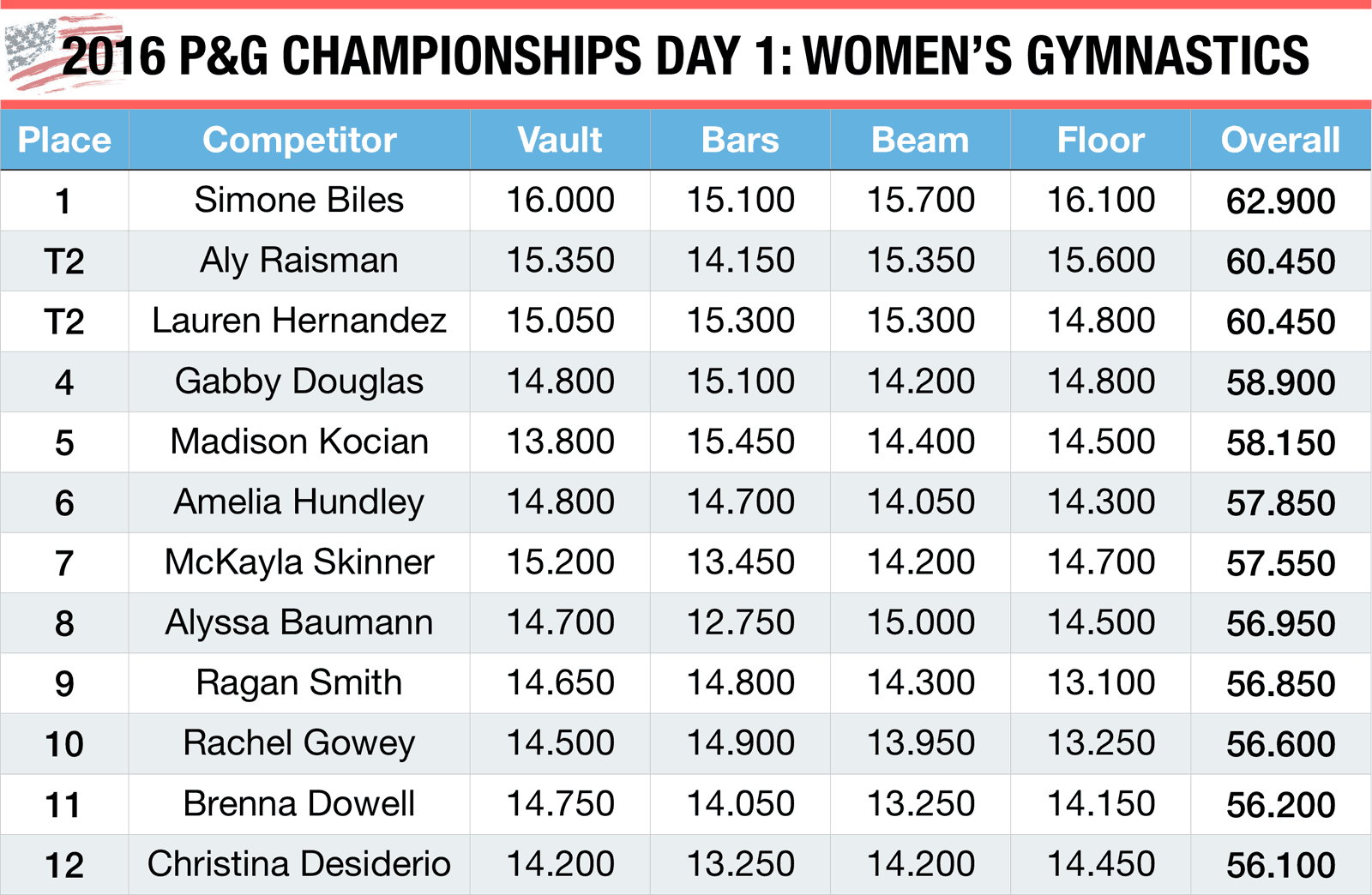 The United States’ top women gymnasts competed at the P&G Gymnastics Championships in St. Louis, with the uber-talented Simone Biles leading the way on Day 1 and relative newcomer Laurie Hernandez making it clear that she too is ready for the big stage. Aly Raisman, who along with Gabby Douglas are the only Fierce Five holdovers still active in competition, finished in a second-place tie with Hernandez behind Biles.