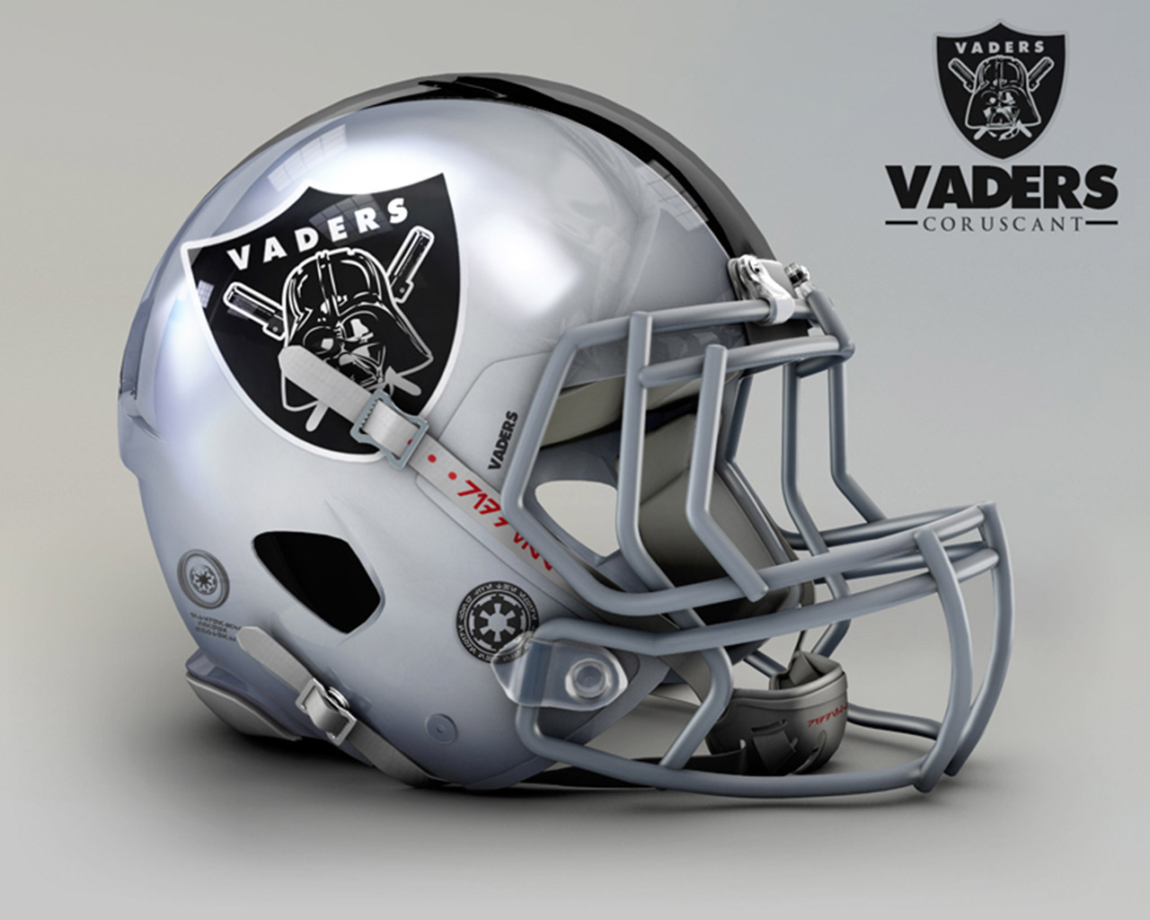 In 2013, artist John Raya created Star Wars-themed football helmets including the following two inspired by the New England Patriots and Oakland Raiders. Remind me which one represents the dark side?