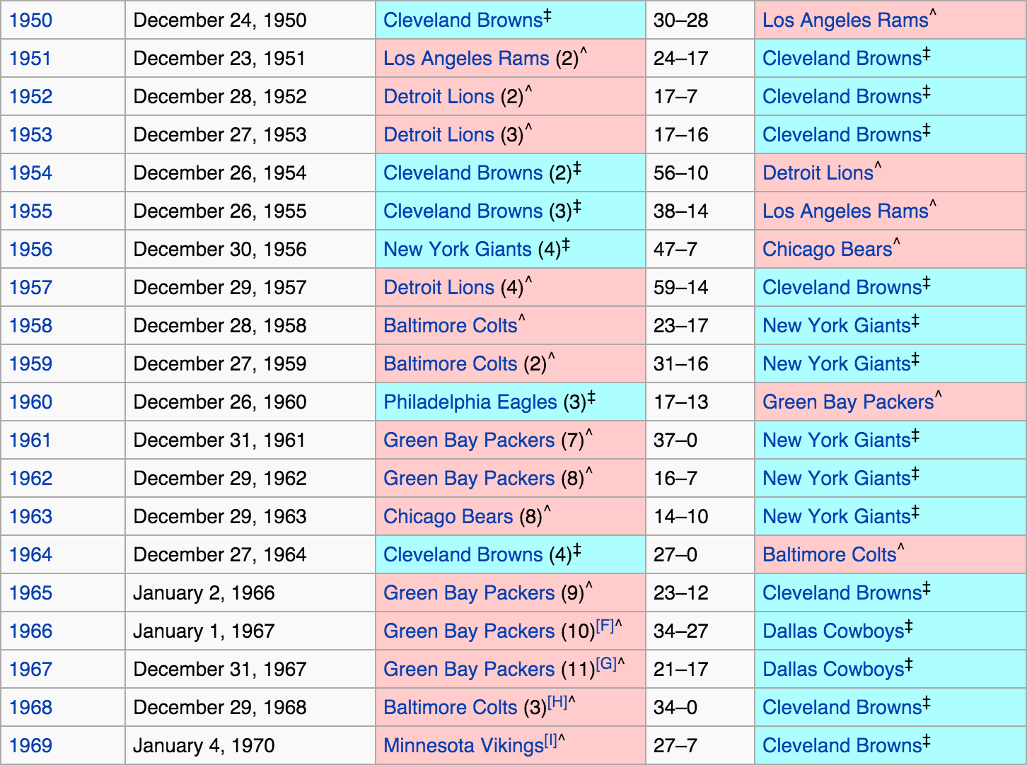 Of the ten championship games from 1950-59, Cleveland appeared in seven of them and won three. Detroit did almost as well, appearing in four title games and winning two. The Browns’ success continued into the next decade, where they made it to the championship game four more times, winning in 1964.