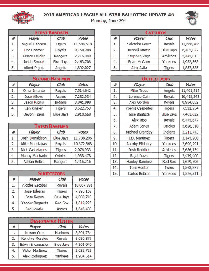 With more than 500 million votes now tallied in the American League All-Star balloting, Blue Jays third baseman Josh Donaldson and Mariners designated hitter Nelson Cruz have mananged to move past the Royals’ Mike Moustakas and Kendrys Morales as starters.