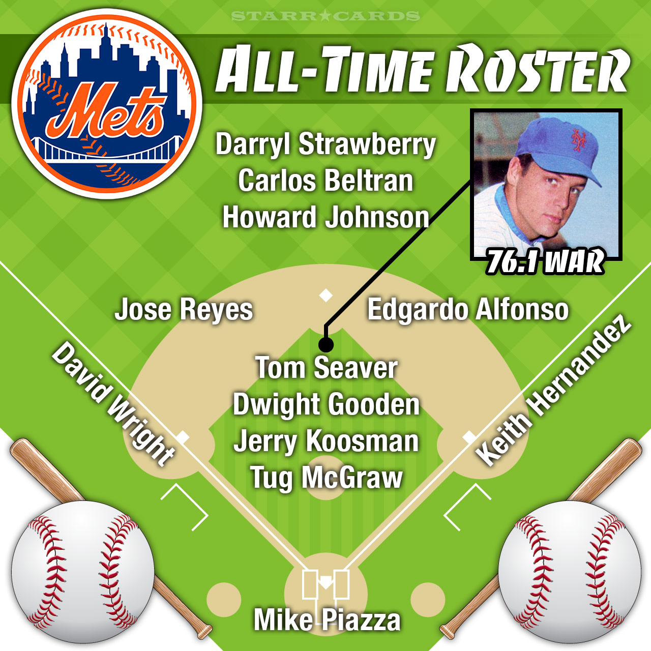 Here we present the entire Mets lineup constructed entirely by choosing the player with the team’s highest WAR at each position, including a rotation of three starting pitchers and one reliever.