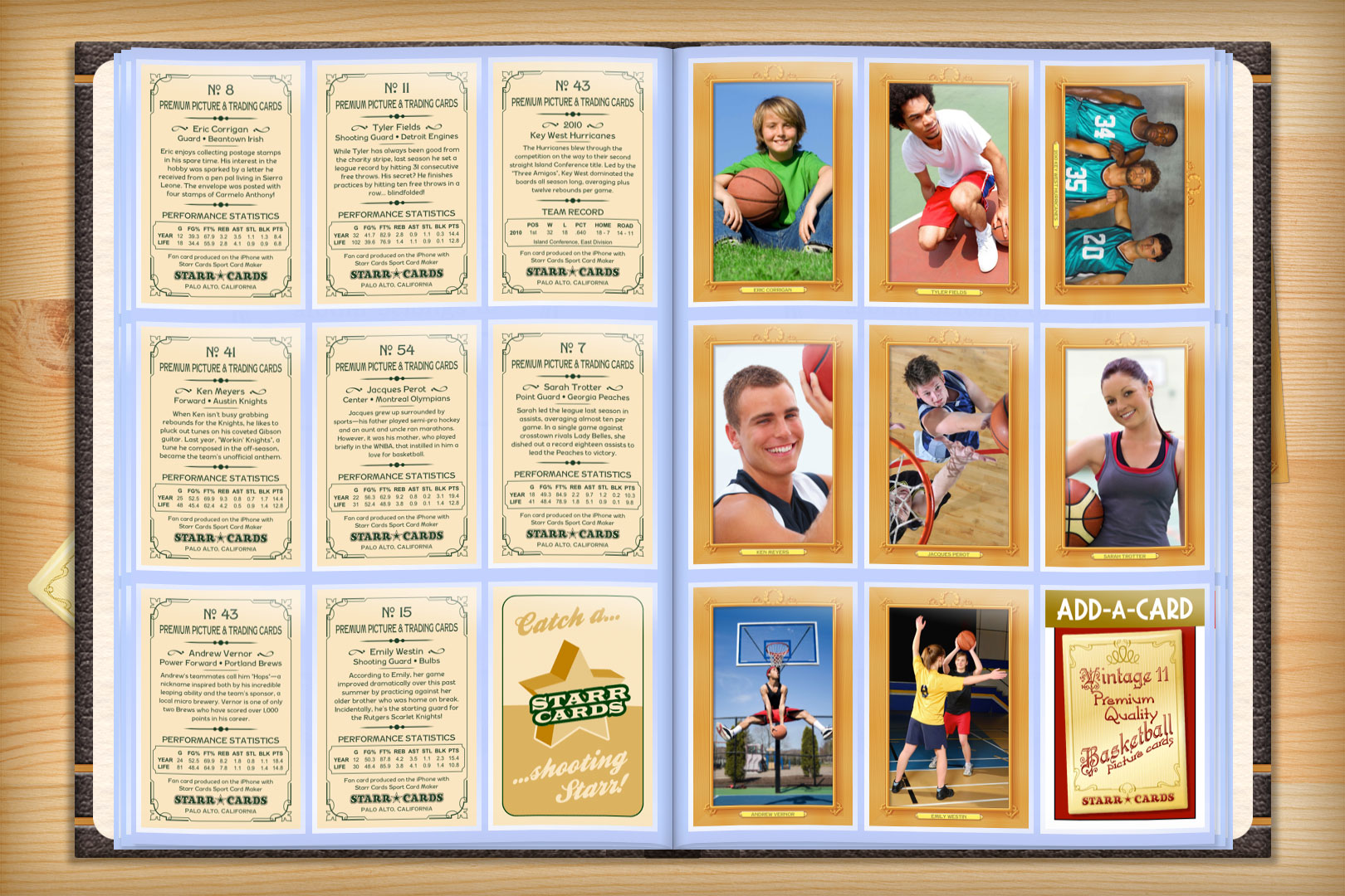 Vintage 11 series is one of several premium custom basketball card designs that can be unlocked within Starr Cards award-winning Basketball Card Maker for the iPhone, iPad, or iPod Touch. Its refined appearance is a perfect fit for a rec league or prep team — each and every card is sure to become a collectable keepsake.