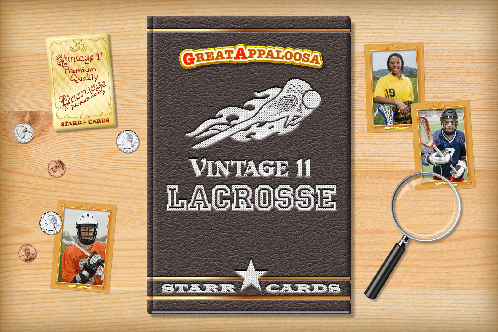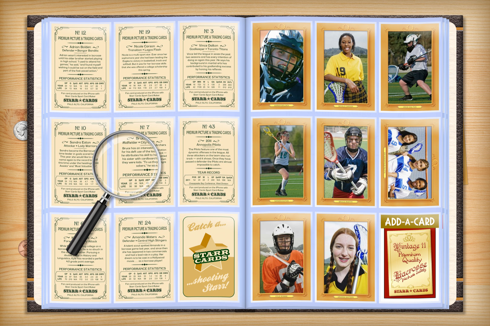 Vintage 11 series is one of several premium custom lacrosse card designs that can be unlocked within Starr Cards award-winning Lacrosse Card Maker for the iPhone, iPad, or iPod. Its refined appearance is the perfect fit for a prep team or lacrosse league — each and every card is sure to become a collectable keepsake.