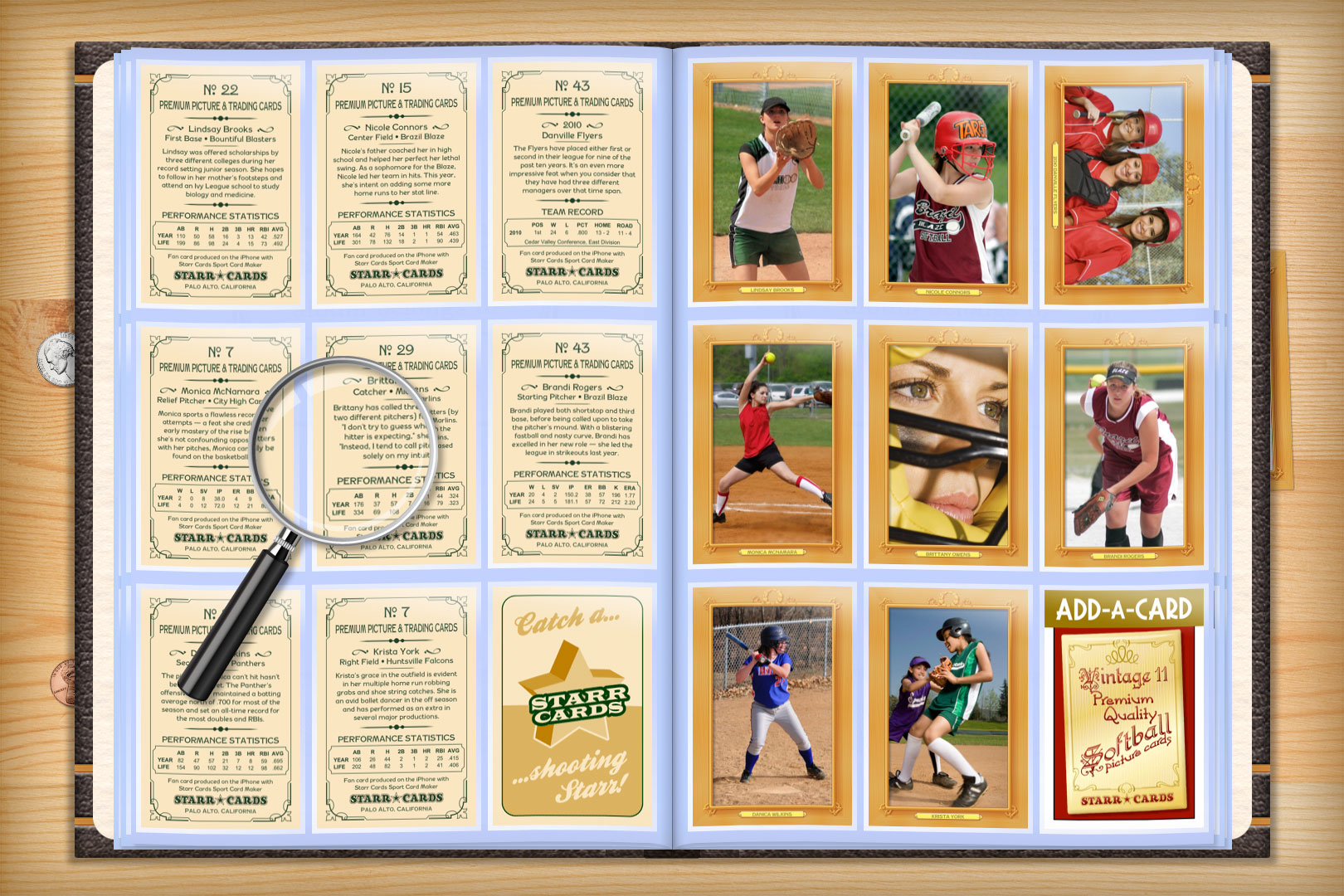 Vintage 11 series is one of several premium custom softball card designs that can be unlocked within Starr Cards award-winning Softball Card Maker for the iPhone, iPad, or iPod. Its refined appearance is the perfect fit for any softball player, team or league — each and every card is sure to become a collectable keepsake.