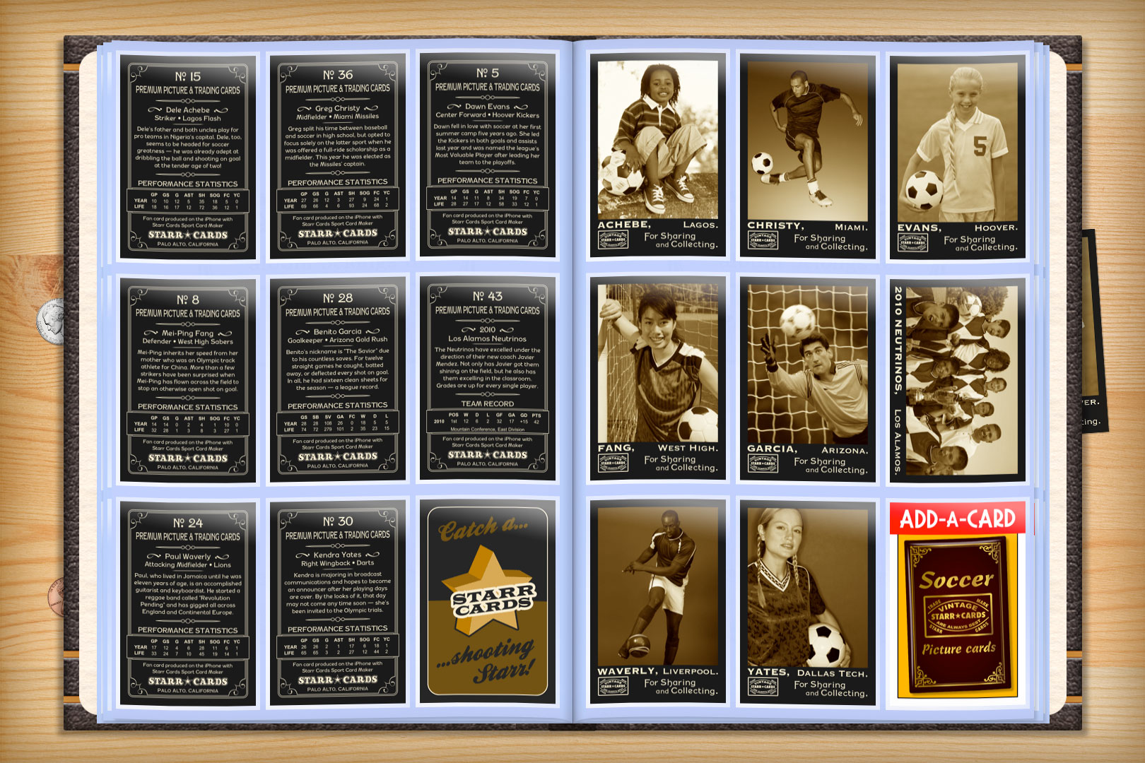 Vintage 95 series is one of several premium custom soccer card designs that can be unlocked within Starr Cards award-winning Soccer Card Maker for the iPhone, iPad, or iPod Touch. Its old-timey appearance is a perfect fit for an amateur league or prep team — each and every card is sure to become a collectable keepsake.