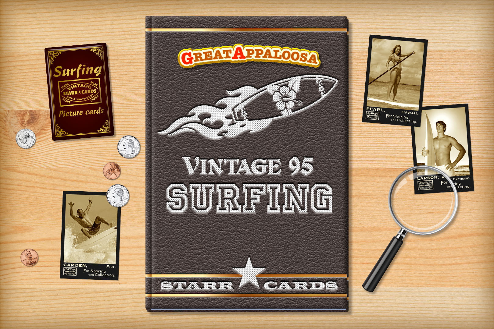 Vintage 95 series is one of several premium custom surfing card designs that can be unlocked within Starr Cards award-winning Surfing Card Maker for the iPhone, iPad, or iPod. Its old-timey appearance is the perfect fit for an up-and-coming surfer or surfing school — each and every card is sure to become a collectable keepsake.
