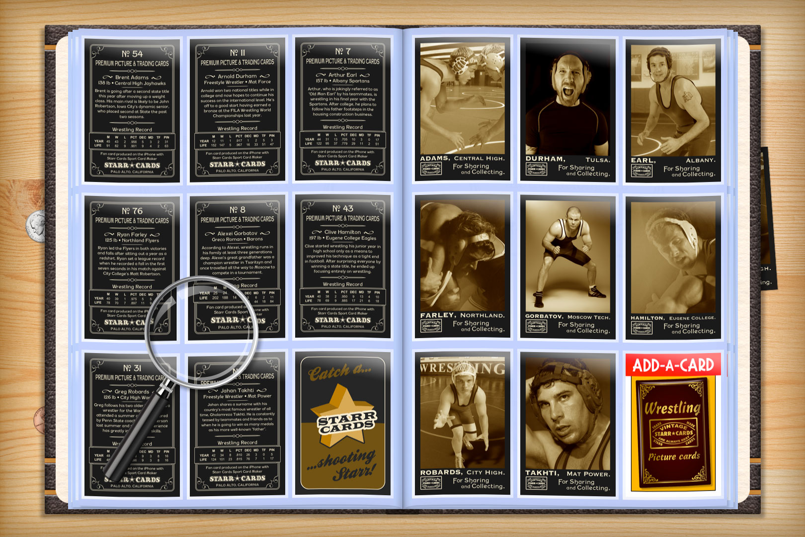 Vintage 95 series is one of several premium custom wrestling card designs that can be unlocked within Starr Cards award-winning Wrestling Card Maker for the iPhone, iPad, or iPod Touch. Its old-timey appearance is the perfect fit for any freestyle, greco-roman, or pro wrestler — each and every card is sure to become a collectable keepsake.